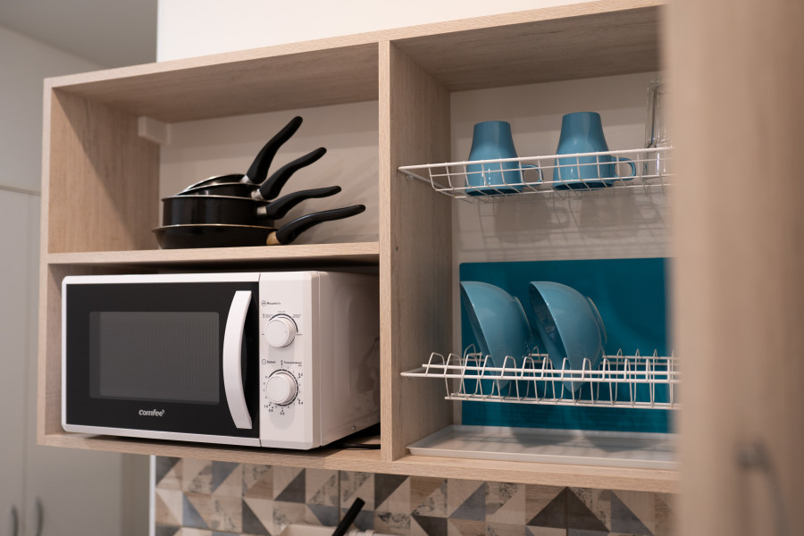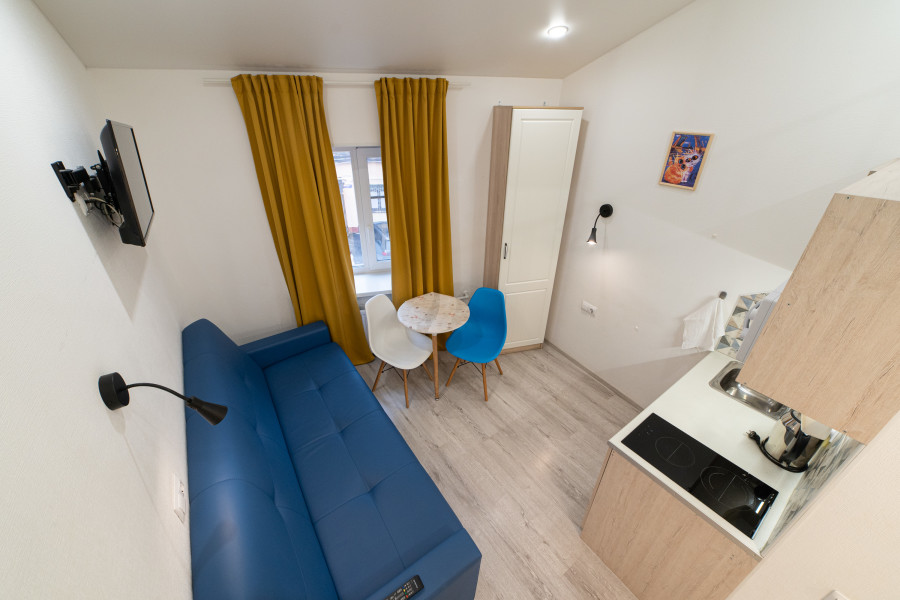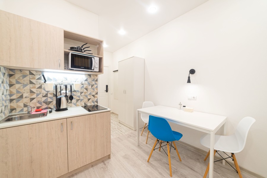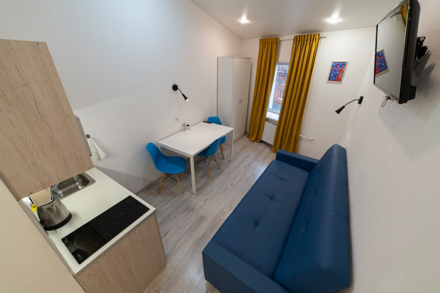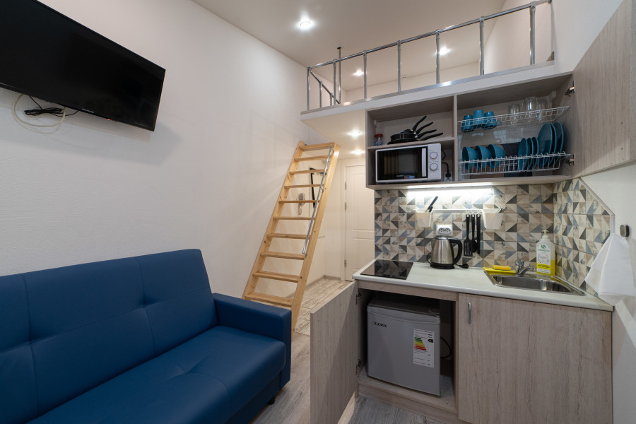- Оборудование: микроволновая печь, мини-холодильник, набор посуды, плита электрическая, телевизор, электрочайник